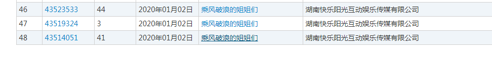 据中国商标网查询结果显示,节目运营方湖南快乐阳光互动娱乐传媒有限公司早在2020年01月02日就申请了3件“乘风破浪的姐姐们”商标,指定使用在第3类、第41类、第44类,化妆品、美容服务和节目制作等商品和服务上。目前,3件商标都已经予以初步审定公告。